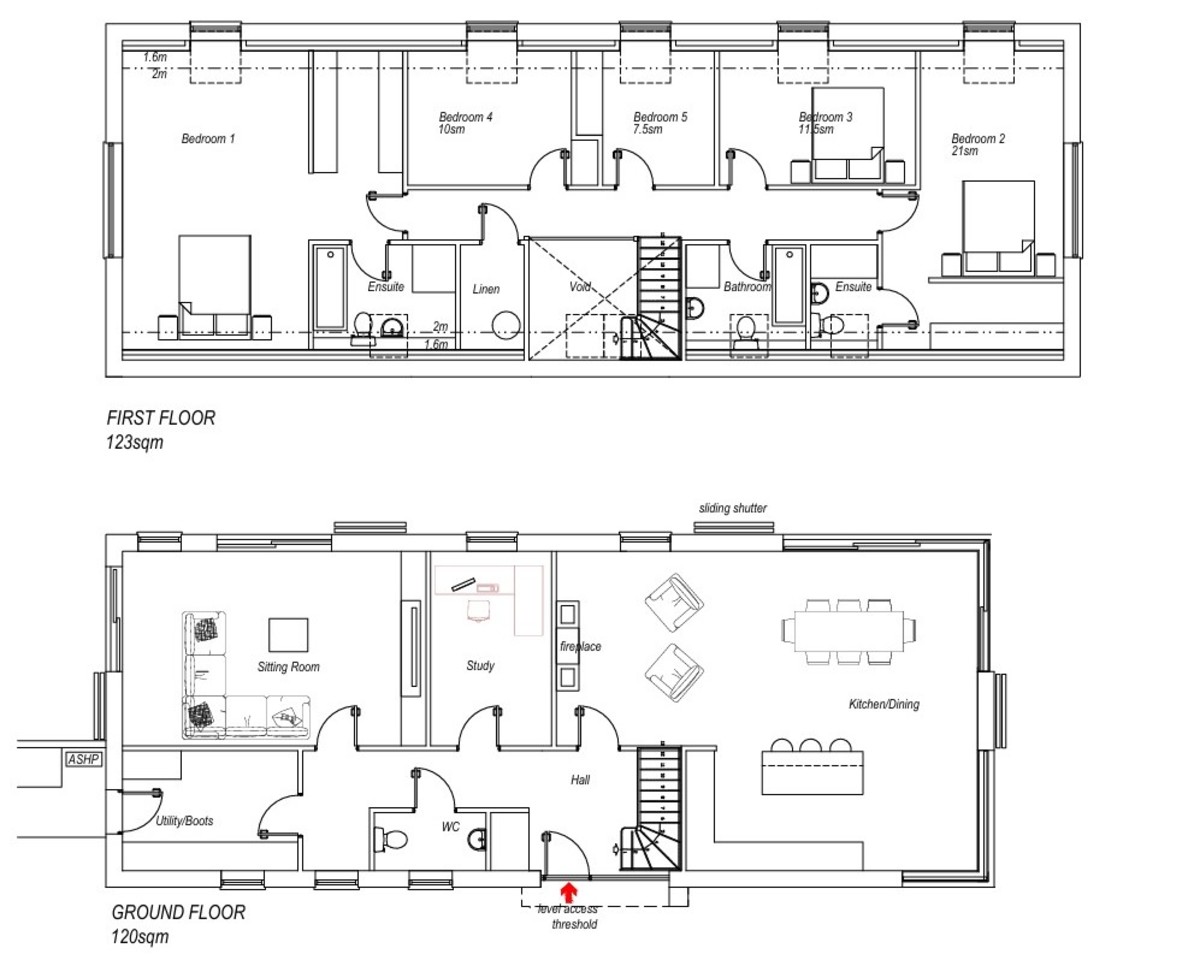South House - 210m2 / 2260sq.ft (not including garage) is a five bedroom detached property with two en suites and walk in wardrobe to the master bedroom. Ground floor Ground floor comprises of a sitting room, utility, study and large kitchen diner to the rear of the property.